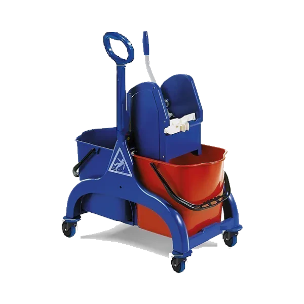 De Duo 17 Mopemmercombinatie is een praktische en robuuste oplossing voor het gescheiden reinigen van vloeren. Het kunststof onderstel met 75 mm wielen zorgt voor soepel transport, terwijl de duwbeugel het duwen en manoeuvreren vergemakkelijkt. De combinatie wordt geleverd met twee 17-liter emmers (rood en blauw) en een kunststof pers voor effectief uitwringen van mopdoeken.