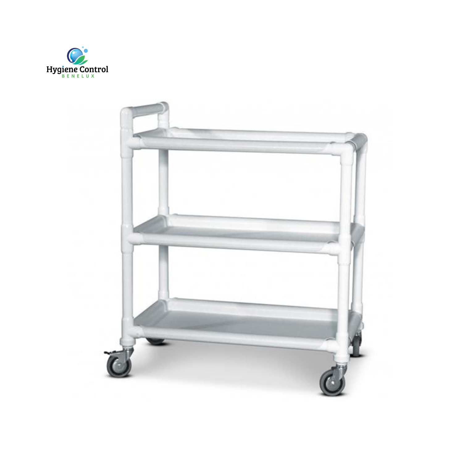 Hygiënische en duurzame serveerwagen van bacterieafstotend kunststof met drie ruime legschappen, eenvoudig reinigbaar en voorzien van geremde zwenkwielen.