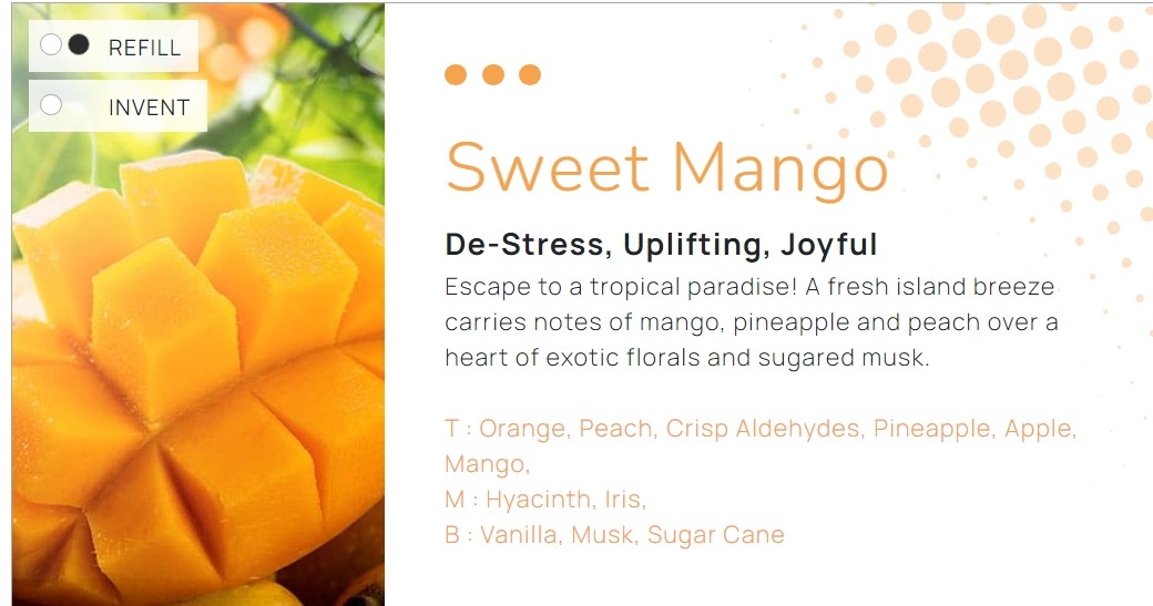 Breng een vleugje tropisch paradijs naar elke ruimte met Sweet Mango. Deze geur combineert exotische tonen van mango, ananas, en perzik met delicate florale accenten en een subtiele, zoete muskus. Perfect om te ontspannen en uw stemming te verfrissen.