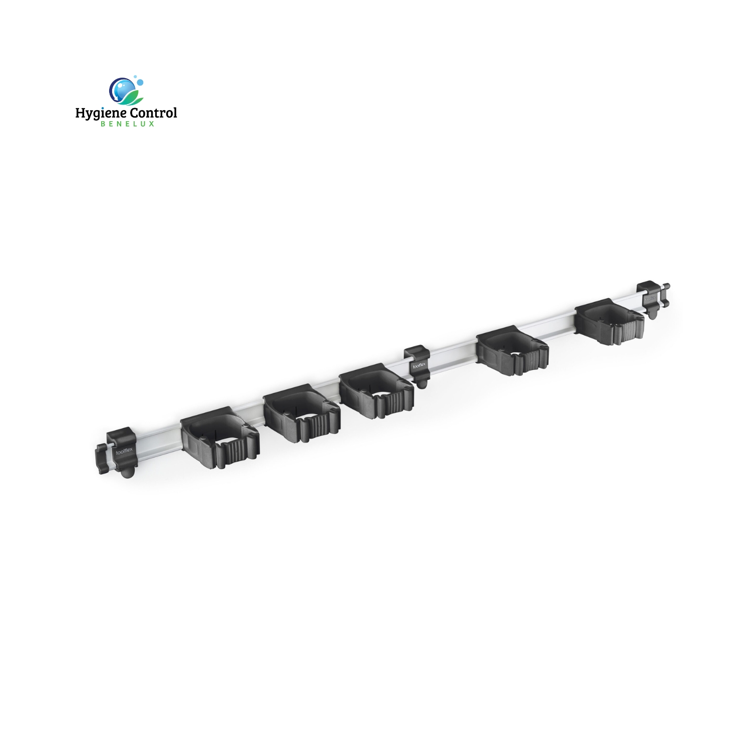 De Toolflex One wandstrip met 5 klemmen is dé professionele oplossing voor het veilig en overzichtelijk opbergen van schoonmaakmaterialen met stelen. Deze aluminium rail van 94 cm is uitgerust met vijf hoogwaardige klemmen die geschikt zijn voor stelen met een diameter van 15 tot 35 mm. De combinatie van kunststof houders en TPE rubber zorgt voor een stevige grip zonder de stelen te beschadigen. Inclusief bevestigingsmateriaal voor eenvoudige montage. Verkrijgbaar in meerdere kleuren, perfect voor kleurcodering of een uniforme werkomgeving.